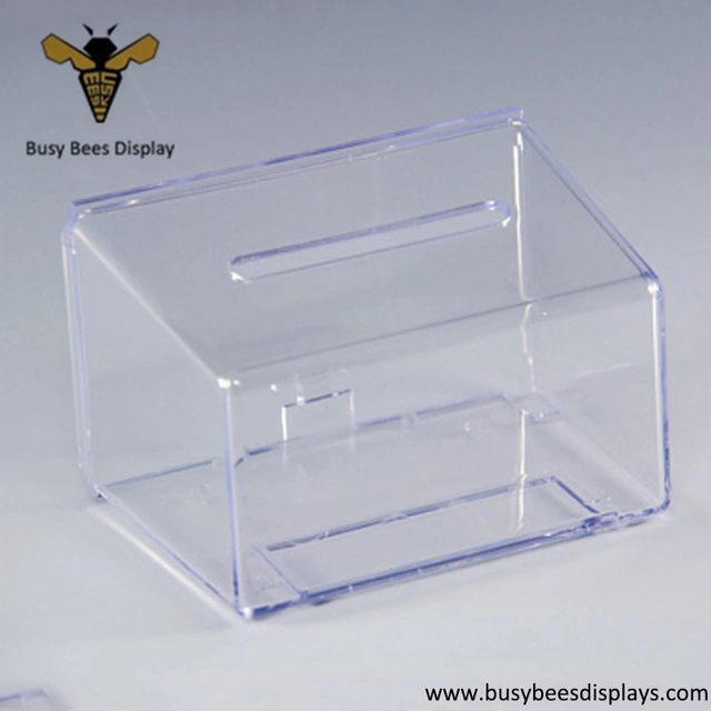 Acrylic charity donation money box and house ballot box for sale by factory with custom design size, logo, color and thickness.